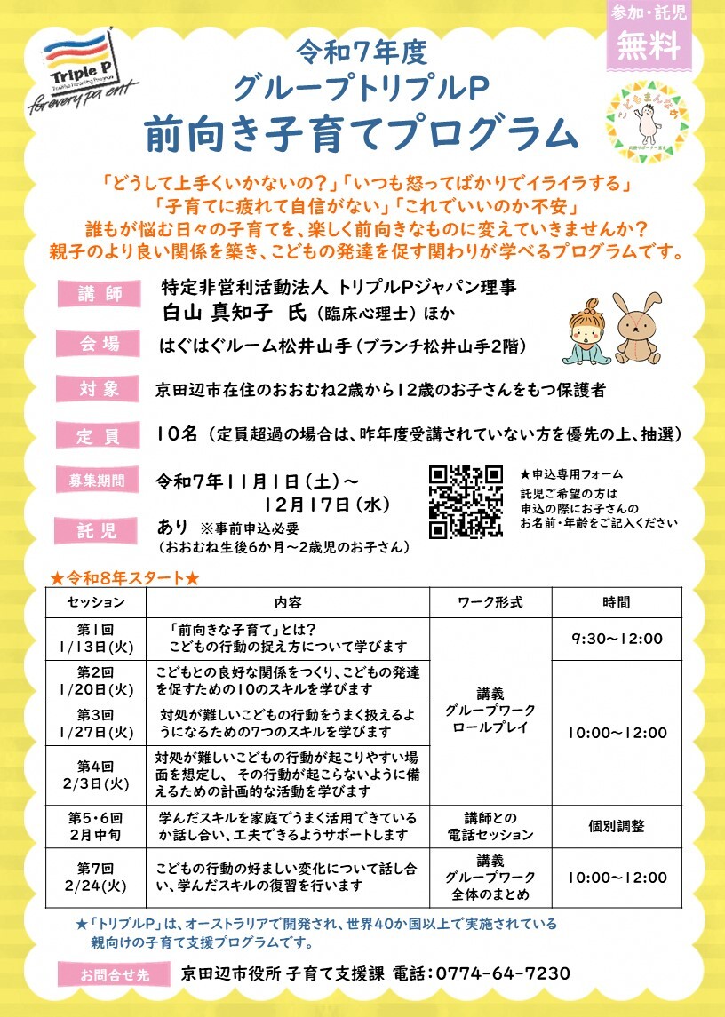 令和8年1月から連続講座スタート! ~グループトリプルP前向き子育てプログラム 全7回~