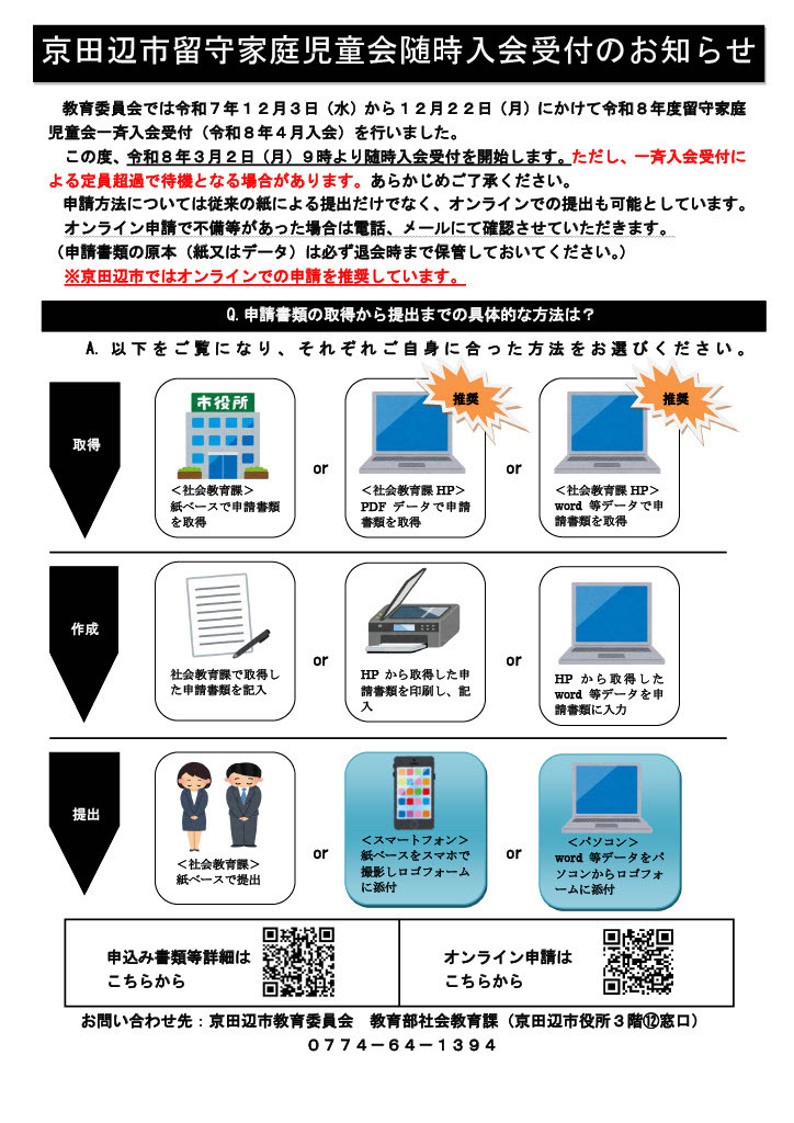 問い合わせ、申込先は小学校、留守家庭児童会ではなく、社会教育課(0774‐64‐1394)までお願いします。