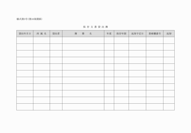 第16条 文書管理担当課へ引き継いだ保存文書を借覧し、又は閲覧しようとする職員は、文書管理担当課に備え置かれた保存文書貸出簿(別記様式第3号)に必要事項を記入し、文書管理担当課職員の確認を受けた上、持ち出すことができる。
