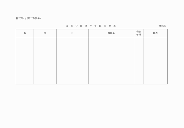 第17条 所管課長は、年度ごとに文書分類保存年限基準表(別記様式第4号)を作成し、文書管理担当課長に提出しなければならない。