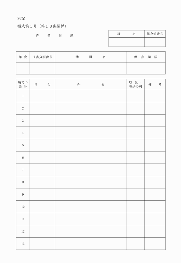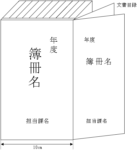 第13条 電子文書以外の文書は、完結の都度、文書管理システムに記録するものとし、年度、文書分類番号及び簿冊名別によって編さん、装丁(別図)し、当該簿冊に件名目録(別記様式第1号)を付さなければならない。