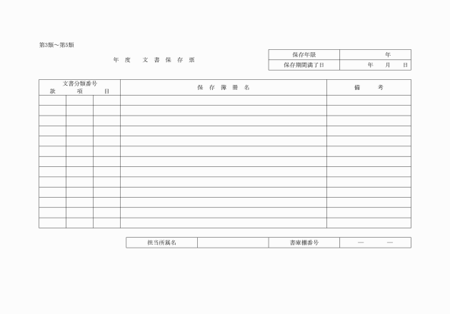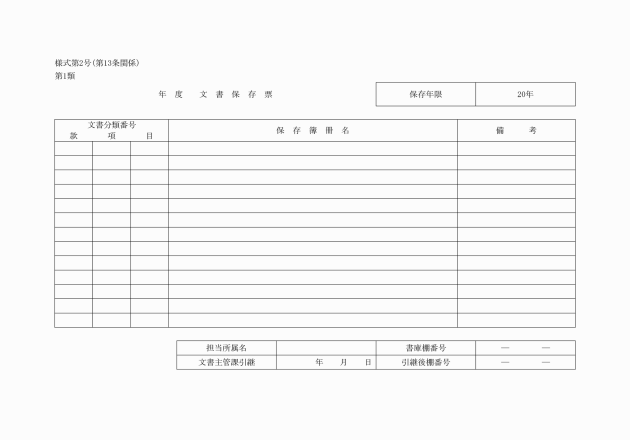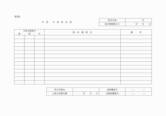 第12条 各類に属する完結文書は、所管課(市長部局以外の事務局を含む。以下同じ。)において整理し、原則として第1類に属する文書は、電子文書にあっては所管課において保存し、電子文書以外の文書にあっては文書管理担当課長が引き継いで保存し、第2類、第3類、第4類及び第5類に属する文書は、所管課において保存しなければならない。