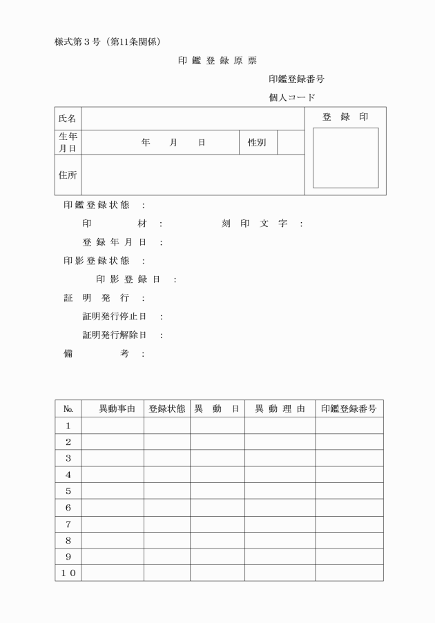 第4条 条例第7条の規定による印鑑登録原票については、印影と印影以外の事項とを別葉の印鑑登録原票に登録するものとし、印影以外の事項を登録した印鑑登録原票については、磁気ディスクをもって調製することができる。