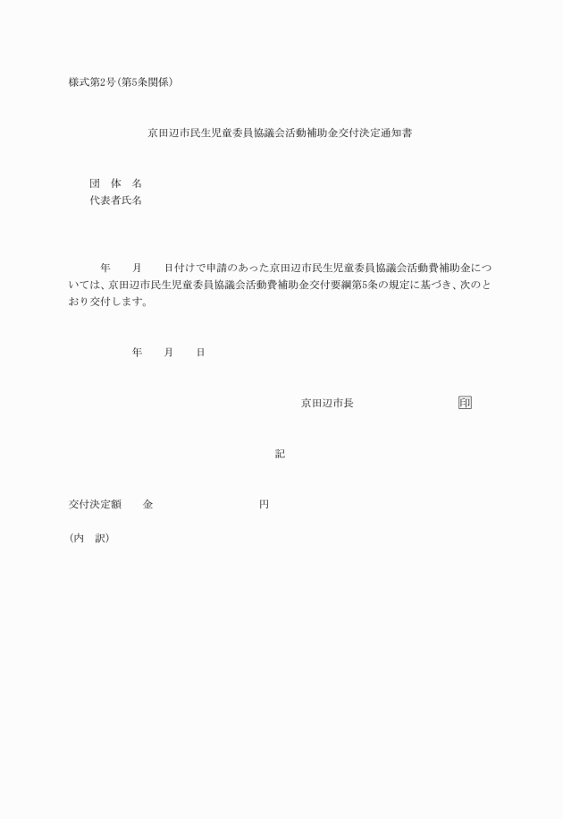 第5条 市長は、補助金の交付を決定したときは、速やかにその決定の内容及びこれに条件を付した場合はその条件を記した京田辺市民生児童委員協議会活動補助金交付決定通知書(別記様式第2号)により、申請者に通知するものとする。