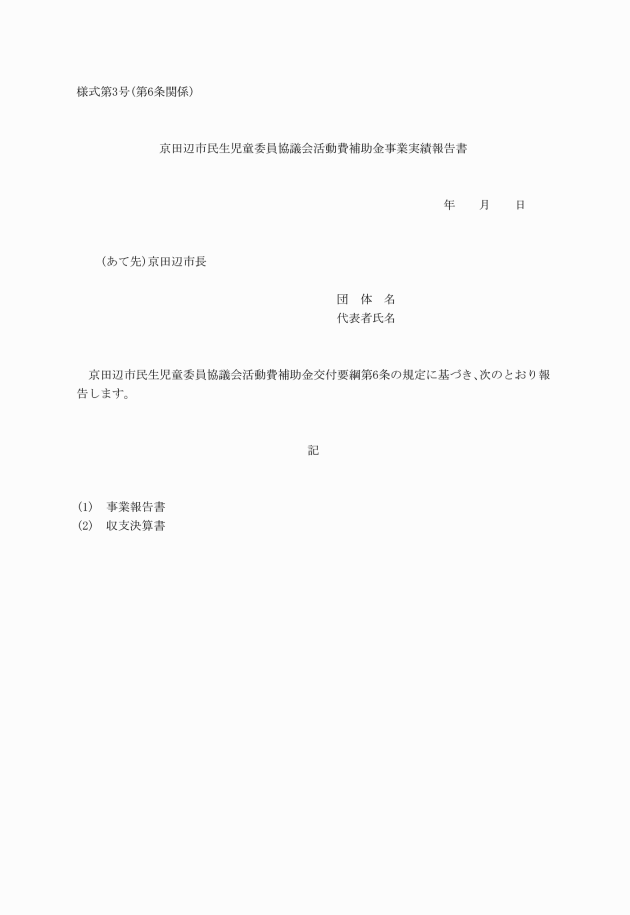 第6条 補助金の交付を受けた者は、京田辺市民生児童委員協議会活動費補助金事業実績報告書(別記様式第3号)を、市長に提出しなければならない。