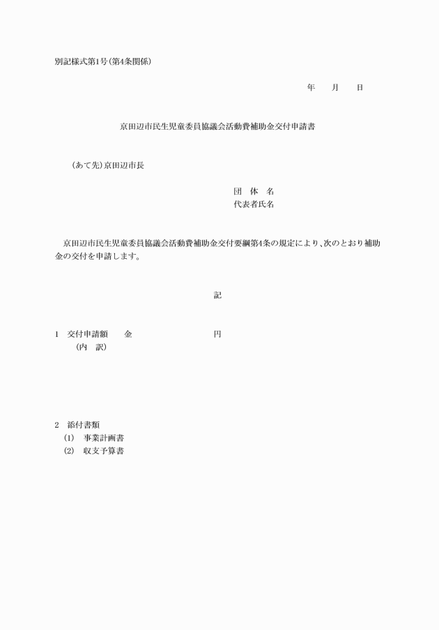 第4条 補助金の交付を受けようとする者(以下「申請者」という。)は、京田辺市民生児童委員協議会活動費補助金交付申請書(別記様式第1号)を、市長に提出しなければならない。