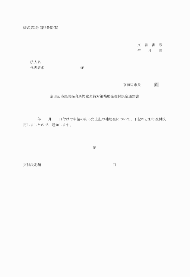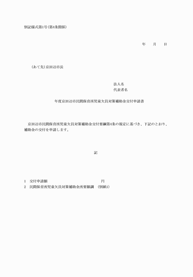 第4条 補助金の交付を受けようとする者は、京田辺市民間保育所児童欠員対策補助金交付申請書(別記様式第1号)を別に定める日までに、市長に提出しなければならない。