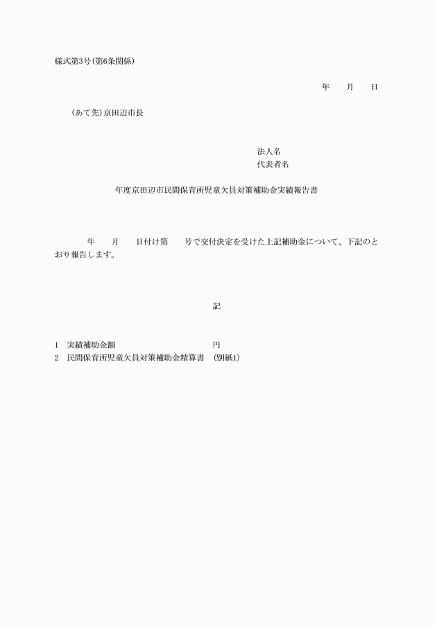 第6条 補助金の交付を受けた者は、京田辺市民間保育所児童欠員対策補助金実績報告書(別記様式第3号)を別に定める日までに、市長に提出しなければならない。