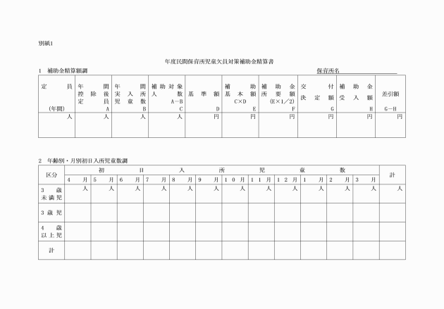 児童福祉法(昭和22年法律第164号)第53条の規定により、厚生労働大臣が定める乳児、1、2歳児、3歳児及び4歳以上児のそれぞれの基本分保育単価(一般生活費分は除く。)の合計額を4で除して得た額(ただし、小数点以下は切り捨てる。) | その年度の4月1日における施設入所定員から10人を控除した人数(入所定員が60人の施設にあっては6人を控除した人数) | 月ごとに左の控除後定員から、その月の初日における当該施設の実入所児童数を控除して得た人数の年間の合算人数に基準額を乗じて得た額の2分の1 |