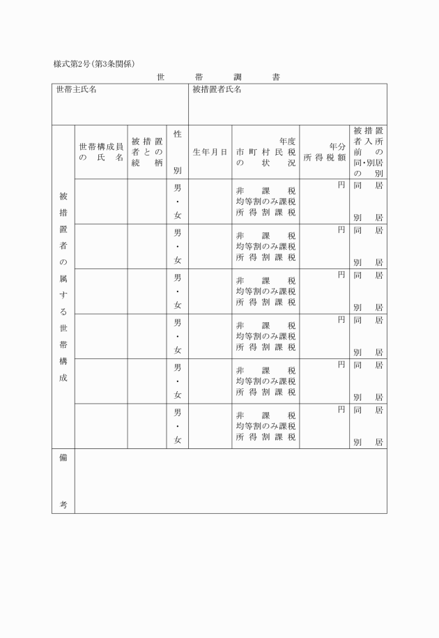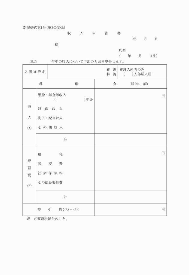第3条 市長は、被措置者の負担金の階層区分の決定に当たっては、当該被措置者から収入申告書(別記様式第1号)及びその内容を証明する書類を提出させるものとする。