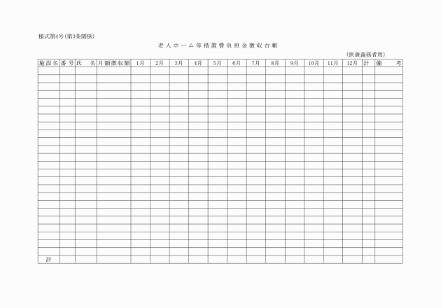 第2条 規則第11条第1項の規定による徴収金(以下「負担金」という。)の額は、月額により決定するものとし、負担金を負担する者が、法第11条第1項第1号、第3号及び第2項(養護老人ホーム及び養護委託に限る。)に規定する被措置者にあっては、老人保護措置費の国庫負担について(昭和47年6月1日厚生省社第451号厚生事務次官通知。以下「交付要綱」という。)別紙2の別表1の対象収入による階層区分によって定まる費用徴収基準月額により算定した額とし、その主たる扶養義務者にあっては、交付要綱別紙2の別表2の税額等による階層区分によって定まる費用徴収基準月額により算定した額とする。ただし、月の途中で施設に入所若しくは退所し、又は養護受託者の家庭に転入し、若しくは転出した被措置者にかかるその入退所し、又は転入出した日の属する月の分の負担金は、次の算式により算定した額(円未満切捨て)とする。