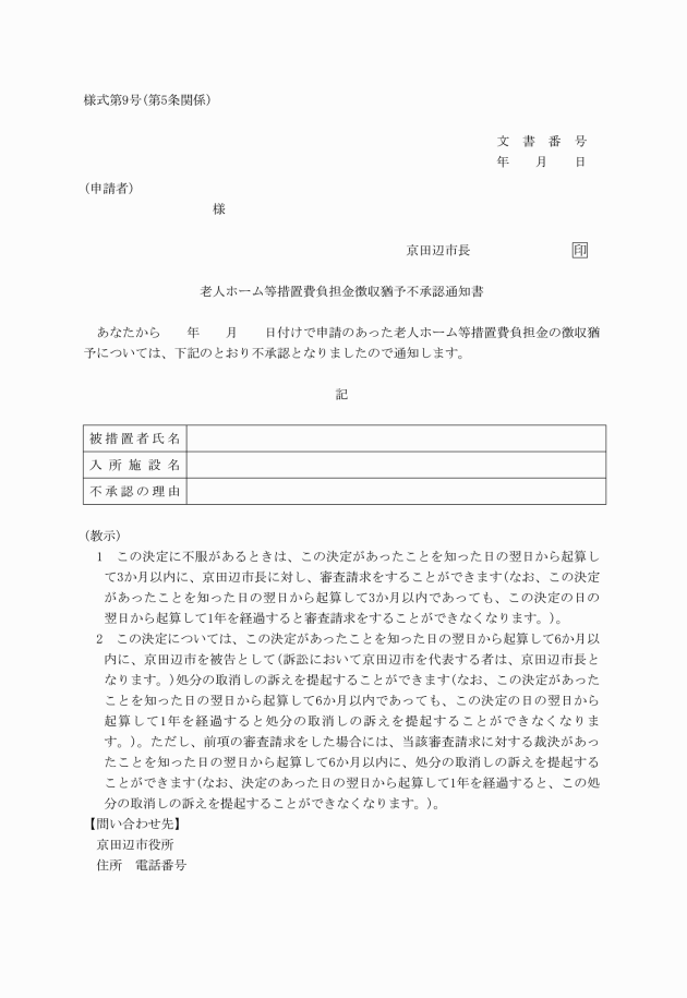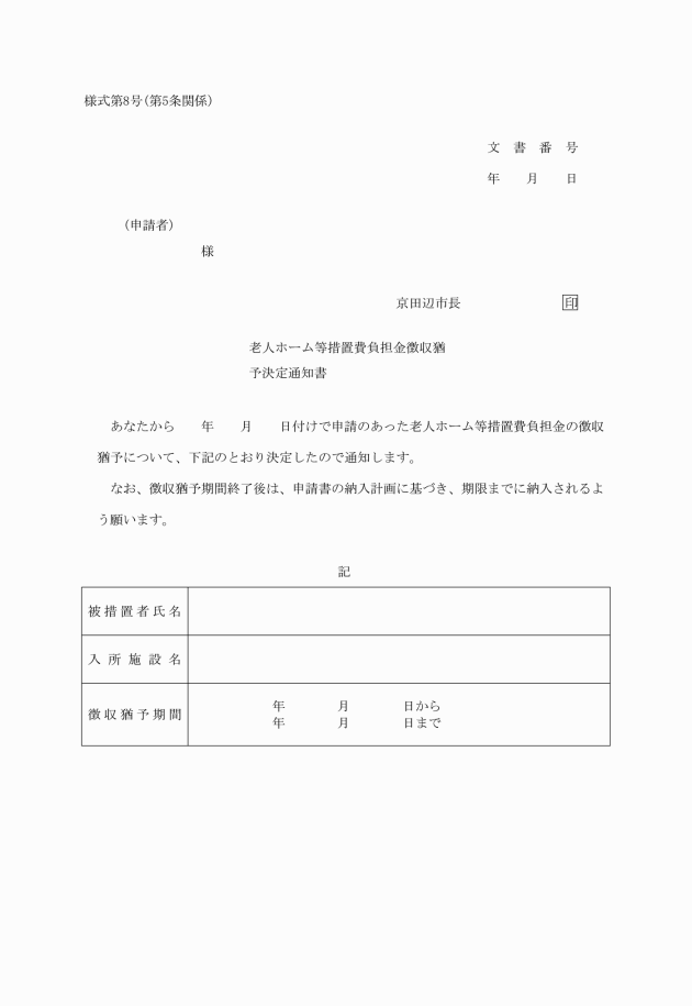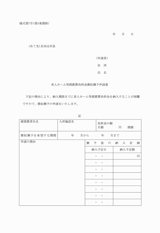 第5条 納入義務者は、災害、病気その他やむを得ない理由により、納入期限までに当該負担金を納入することが困難なため、徴収の猶予を希望するときは、老人ホーム等措置費負担金徴収猶予申請書(別記様式第7号)に猶予の理由を証する書類を添えて市長に申請するものとする。