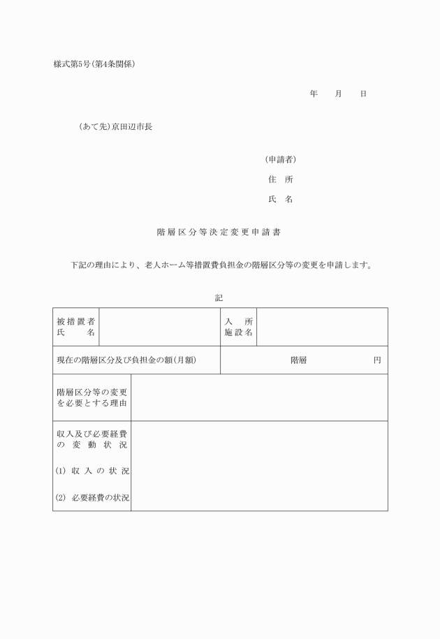 第4条 納入義務者は、年度途中において災害、病気その他やむを得ない理由により当該年度の収入又は必要経費に著しい変動が生じ、既に決定された階層区分等の変更を希望するときは、階層区分等決定、変更申請書(別記様式第5号)に当該申請の理由を証する書類を添えて、市長に申請するものとする。