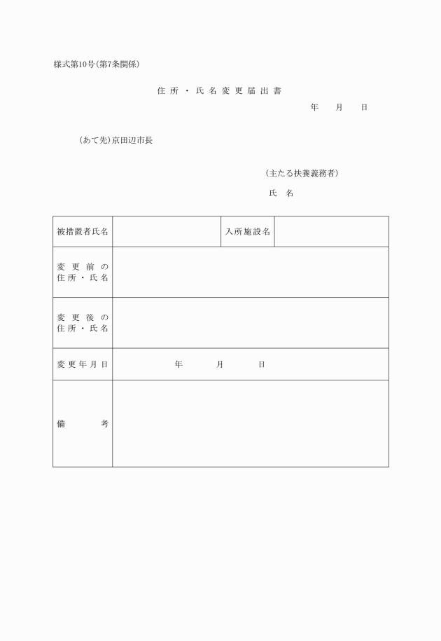 第7条 主たる扶養義務者は、住所、氏名を変更したときは、速やかに住所、氏名変更届(別記様式第10号)を市長に提出しなければならない。