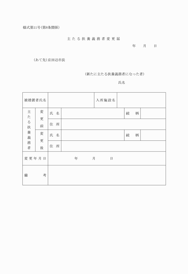 第8条 主たる扶養義務者の死亡その他の理由により、主たる扶養義務者に変更があったときは、新たに主たる扶養義務者となった者は、速やかに主たる扶養義務者変更届(別記様式第11号)を市長に提出しなければならない。