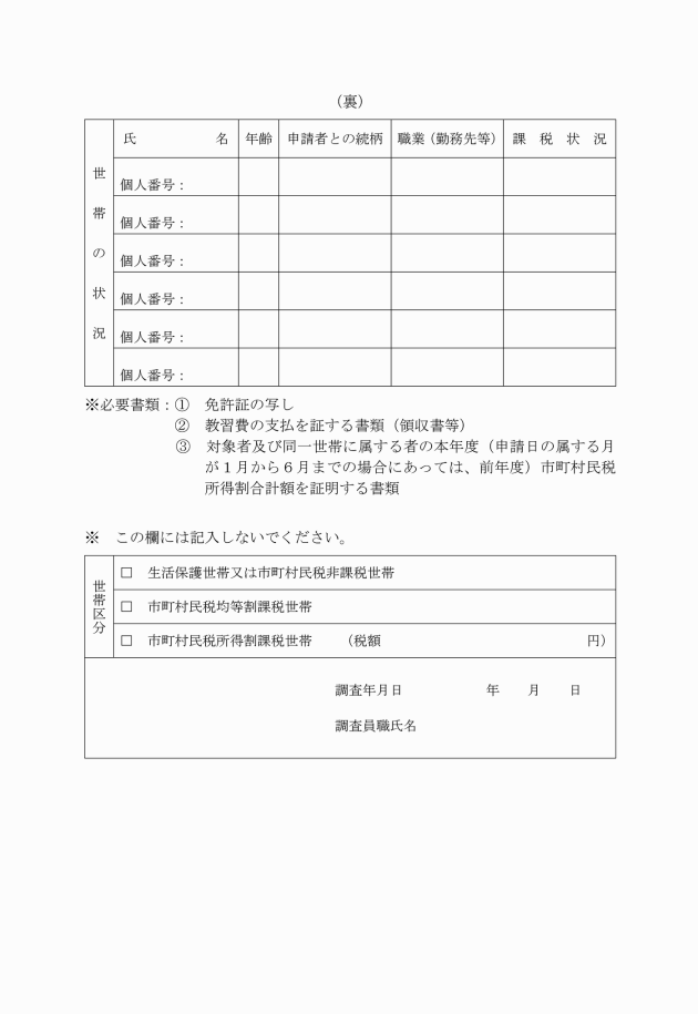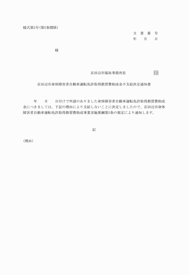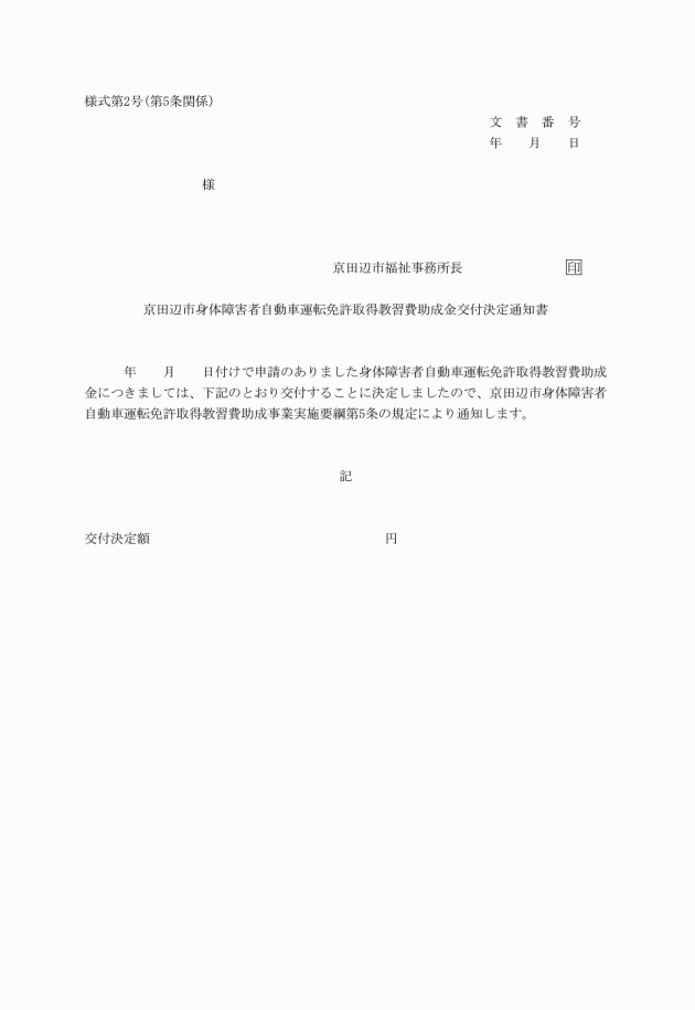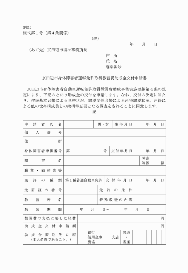第4条 助成金の交付を受けようとする者(以下「申請者」という。)は、京田辺市身体障害者運転免許取得教習費助成金交付申請書(別記様式第1号)を福祉事務所長に提出しなければならない。