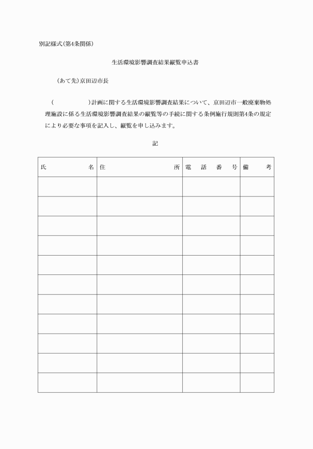 ○京田辺市一般廃棄物処理施設に係る生活環境影響調査結果の縦覧等の手続に関する条例施行規則