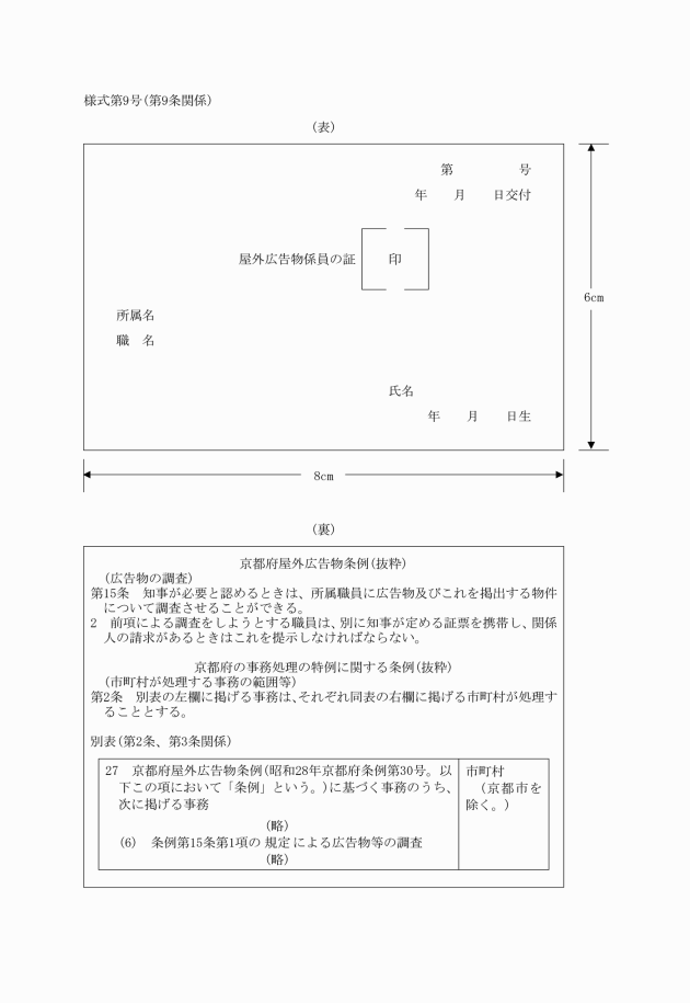 第9条 条例第15条第2項に規定する証票の様式は、別記様式第9号とする。