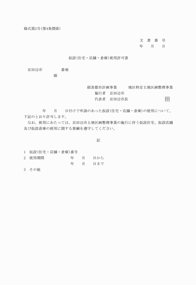 ○京田辺市土地区画整理事業の施行に伴う仮設住宅、仮設店舗及び仮設倉庫の使用に関する要綱
