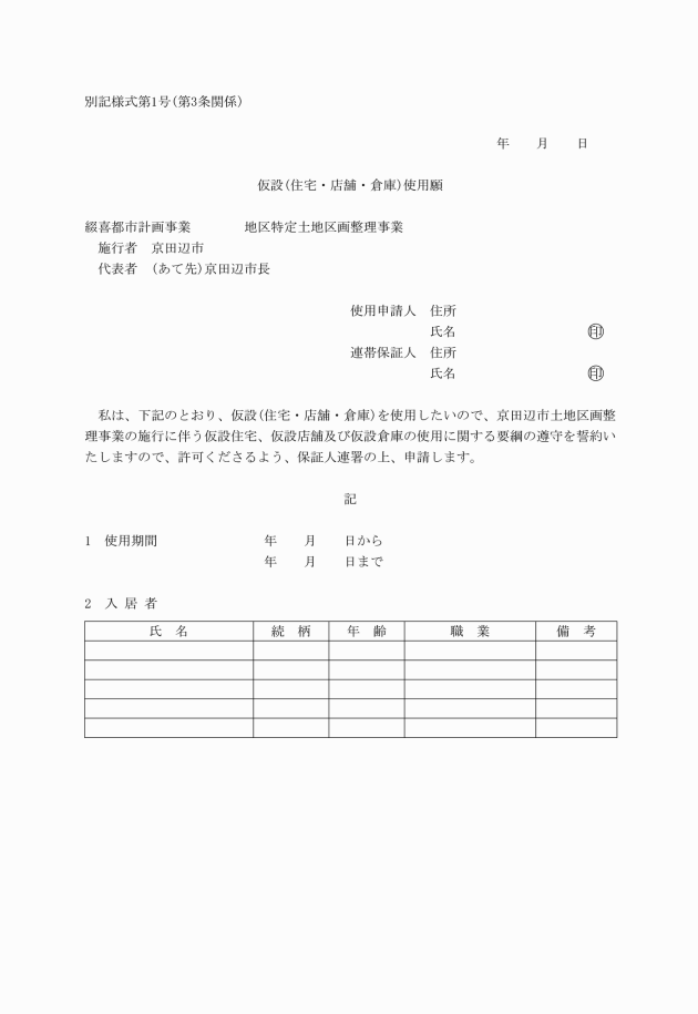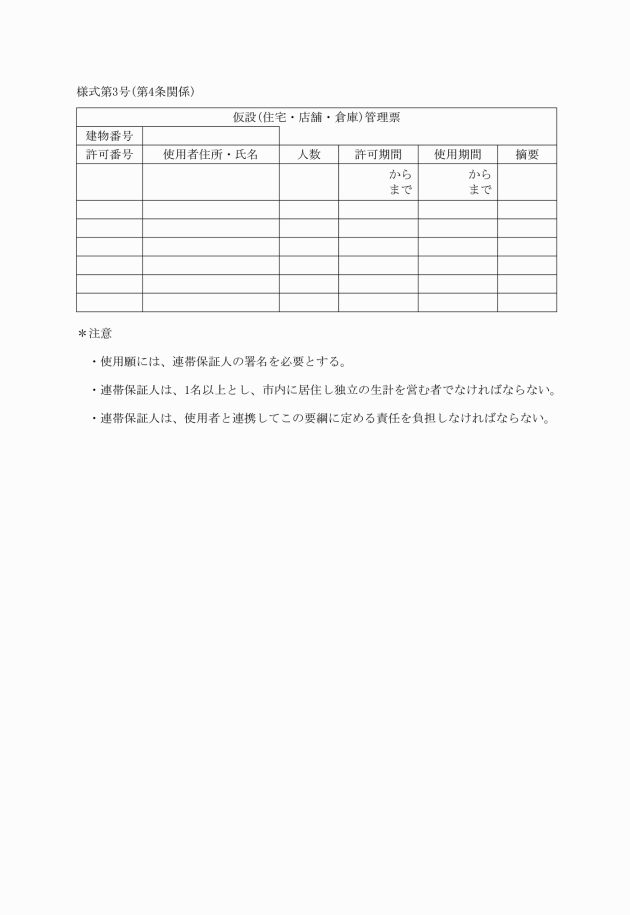 第3条 仮設住宅等を使用しようとする者は、仮設(住宅・店舗・倉庫)使用願(別記様式第1号。以下「使用願」という。)を市長に提出しなければならない。