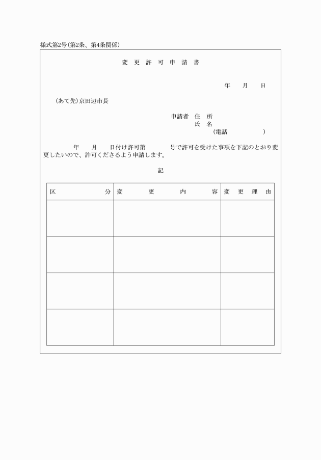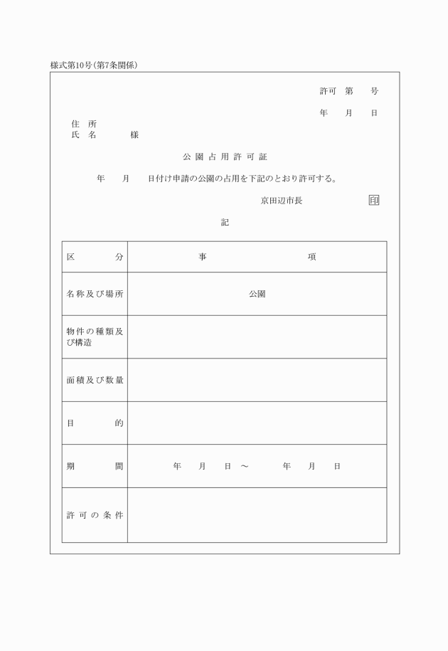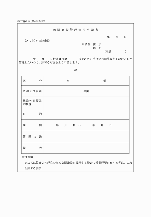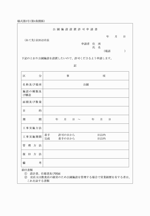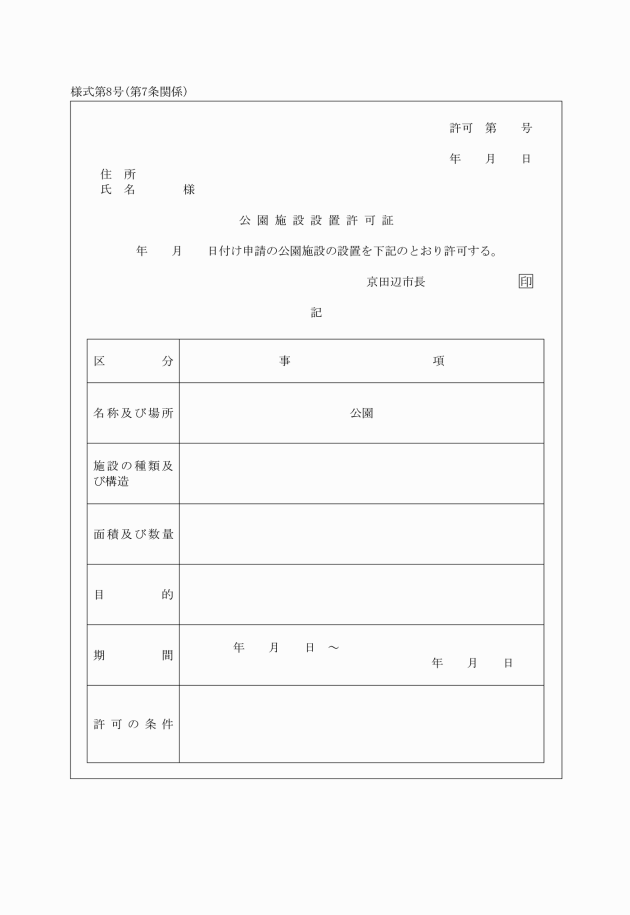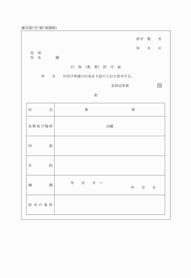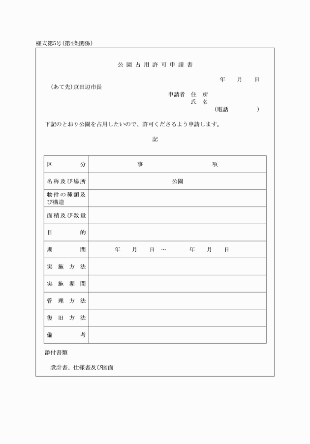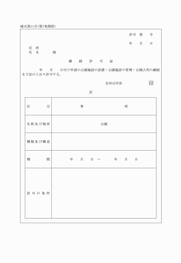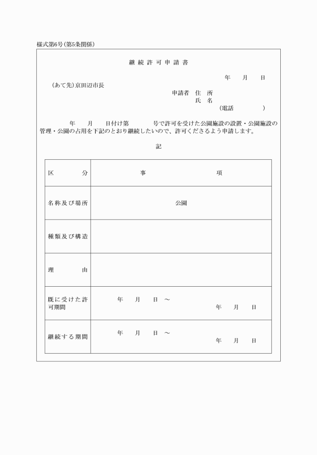 第5条 法第5条第2項又は法第6条第1項の規定により許可を受けた者が、許可期間満了後引き続き公園施設を設置若しくは管理し、又は都市公園を占用するときは、許可期間満了の日の20日前までに継続許可申請書(別記様式第6号)を提出しなければならない。