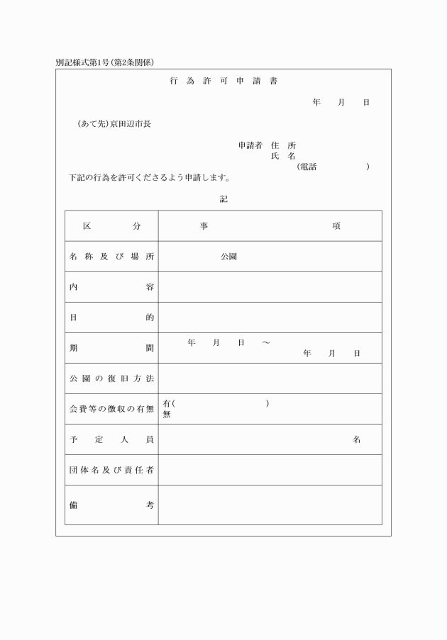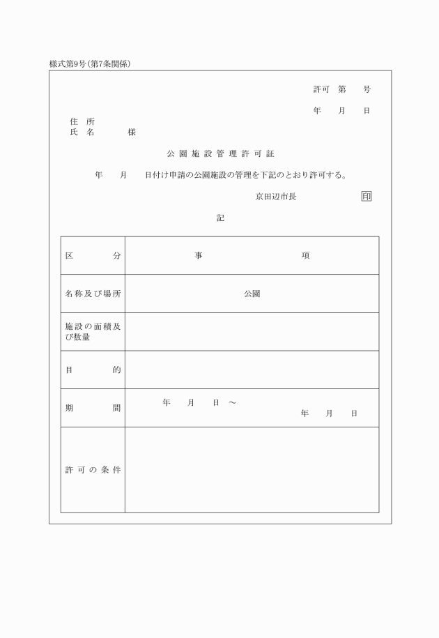 第1条 この規則は、京田辺市都市公園条例(昭和52年京田辺市条例第1号。以下「条例」という。)の施行について必要な事項を定めるものとする。