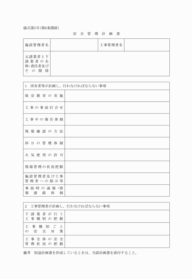 (1) 安全管理計画書(消防長が必要と認める場合)(別記様式第5号)