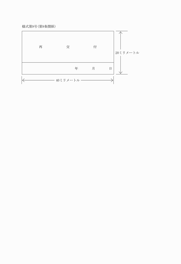 第9条 消防長は、市規則第27条第1項の規定により完成検査済証再交付申請書を受理したときは、その内容を審査し、完成検査済証に再交付印(別記様式第9号)を押して再交付しなければならない。この場合において、完成検査済証に記載する市長名は、交付時と再交付時で相違することが予想されるため記載しないものとする。