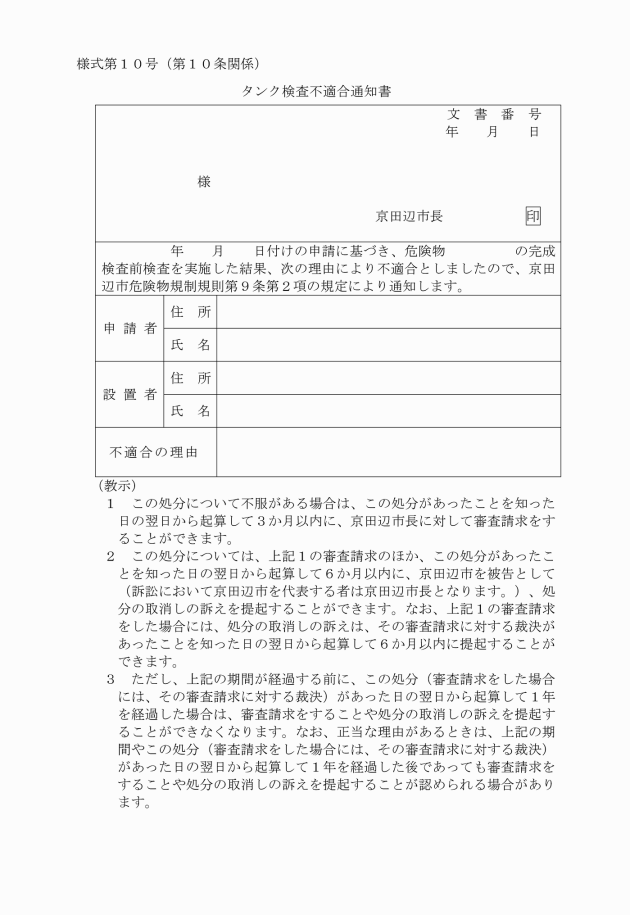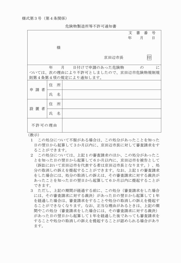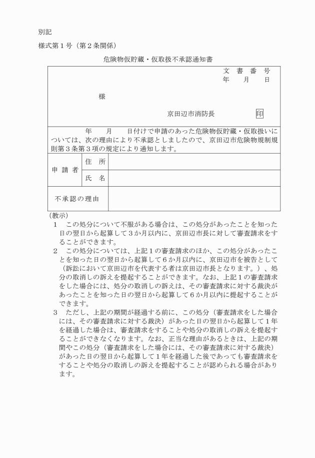 第1条 この告示は、消防法(昭和23年法律第186号。以下「法」という。)、危険物の規制に関する政令(昭和34年政令第306号。以下「令」という。)及び危険物の規制に関する規則(昭和34年総理府令第55号。以下「規則」という。)並びに京田辺市危険物規制規則(平成25年京田辺市規則第55号。以下「市規則」という。)に基づく危険物の規制に関する事務処理について、必要な事項を定めるものとする。