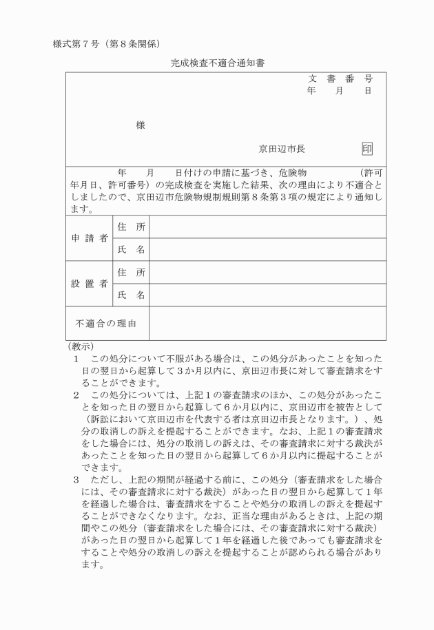 第7条 消防長は、市規則第8条第1項の規定により危険物製造所等完成検査申請書(以下「完成検査申請書」という。)を受理したときは、完成検査の期日を申請者に通知し、完成検査を行わなければならない。