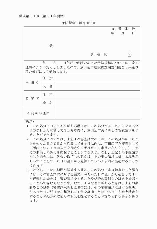 第11条 消防長は、市規則第23条第1項の規定により予防規程制定・変更認可申請書を受理した場合は、申請内容を審査し、法第10条第3項の技術上の基準に適合し、かつ、規則第60条の2第1項各号に掲げる事項について具体的に定め、火災の予防のために適当であると認めるときは、市規則第23条第3項に定める認可書を交付し、適当でないと認めるときは、予防規程不認可通知書(別記様式第11号)により、その旨を通知しなければならない。