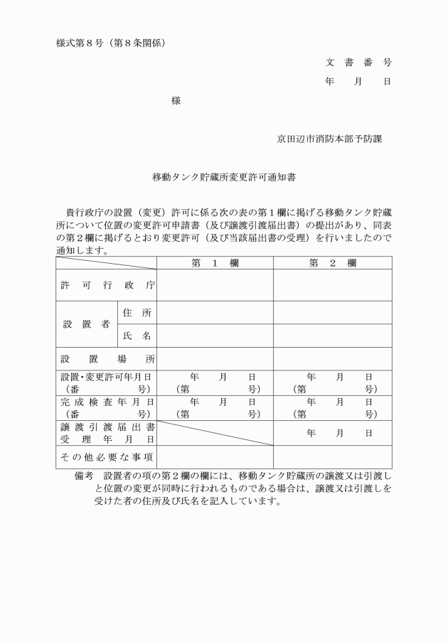 2 消防長が、移動タンク貯蔵所の常置場所の変更許可に係る完成検査済証を交付したときは、消防本部予防課は、変更前の常置場所の位置を管轄する行政庁の危険物規制事務主管課に移動タンク貯蔵所変更許可通知書(別記様式第8号)により、その旨を通知しなければならない。