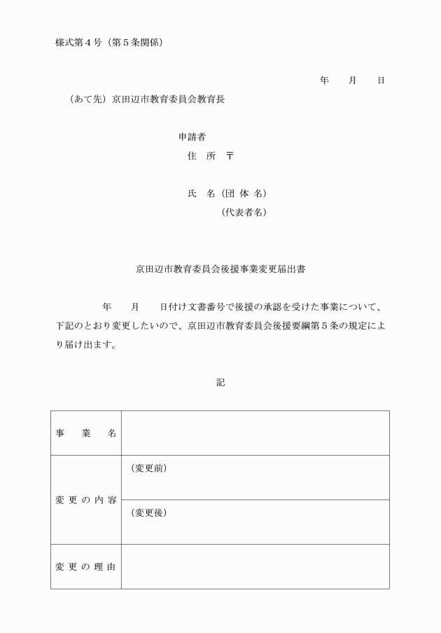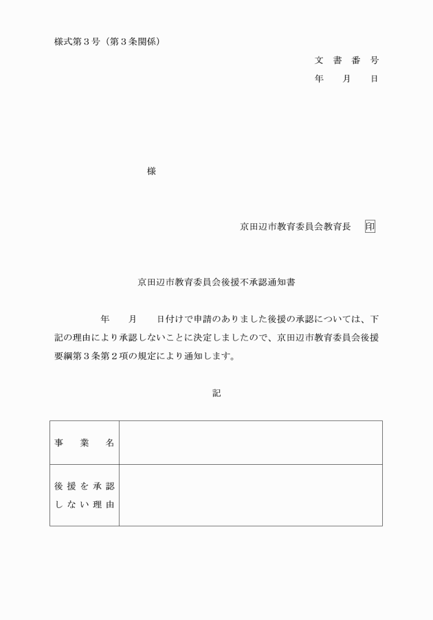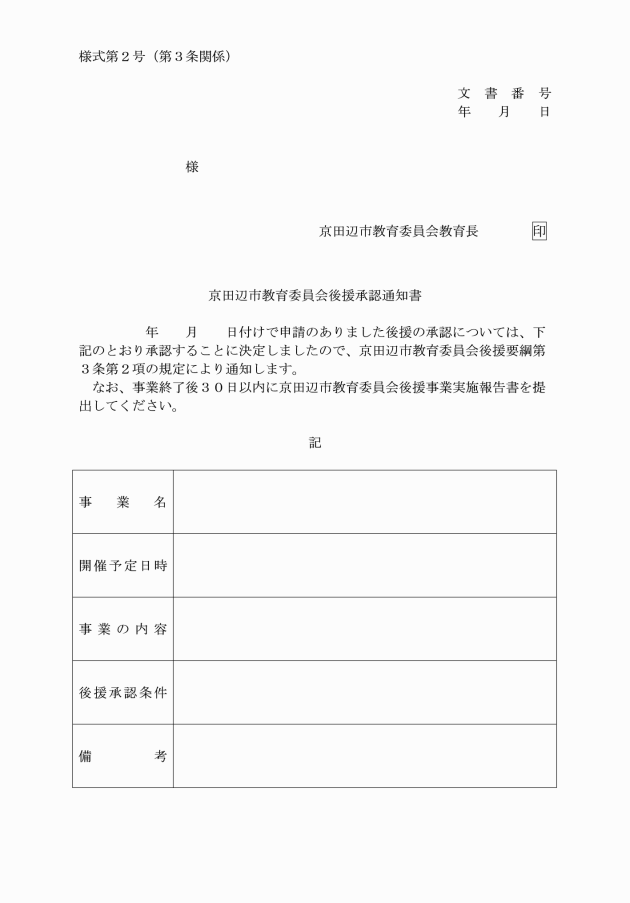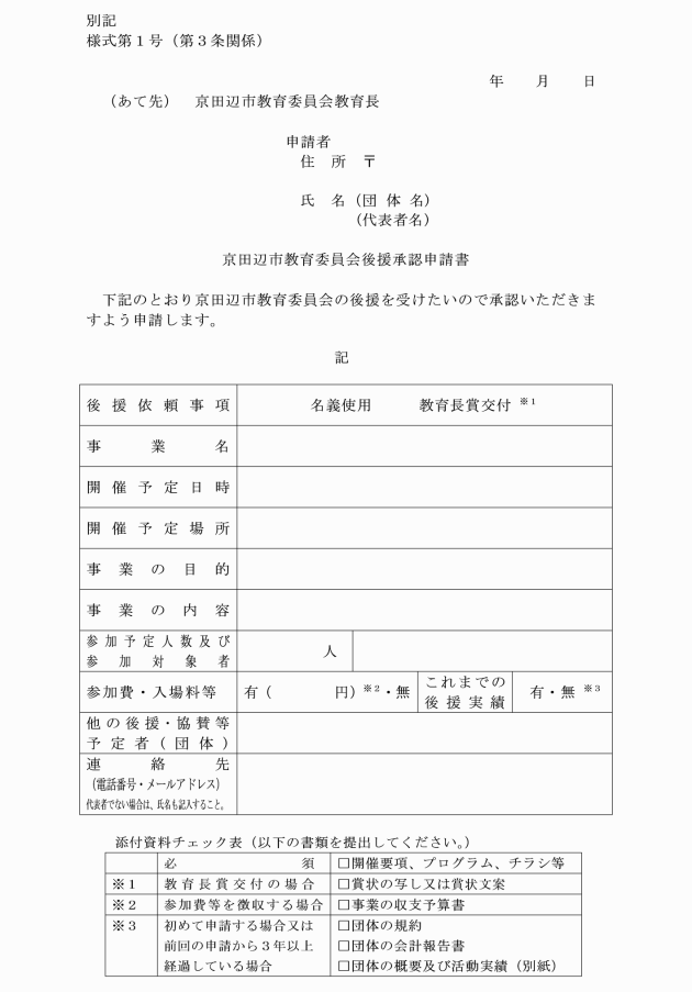 第3条 委員会の後援を受けようとする者は、事業を実施する日の15日前までに、京田辺市教育委員会後援承認申請書(別記様式第1号)に必要な書類を添えて教育長に提出して承認を受けなければならない。