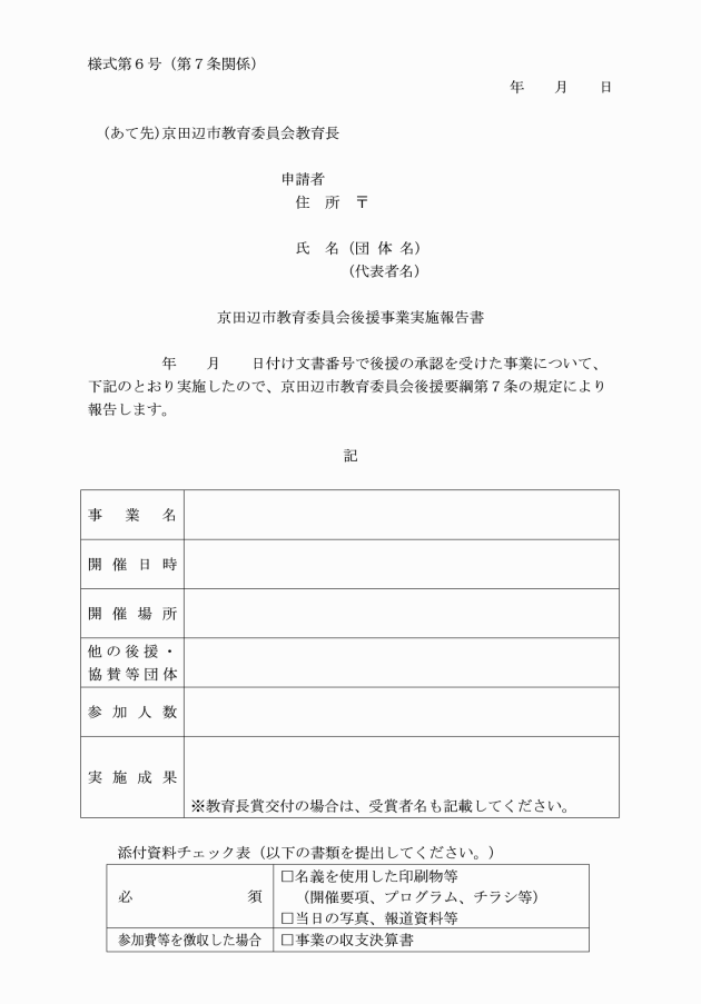 第7条 後援を受けた者は、当該後援事業の終了後30日以内に京田辺市教育委員会後援事業実施報告書(別記様式第6号)にちらし、ポスター等事業の内容が把握できる資料を添えて、教育長に提出しなければならない。