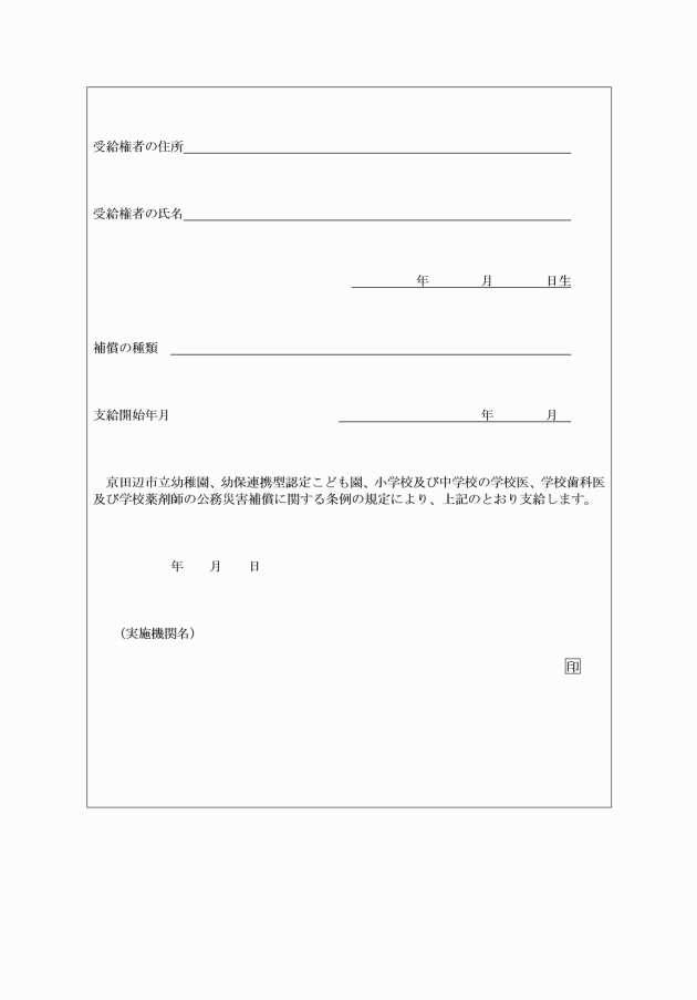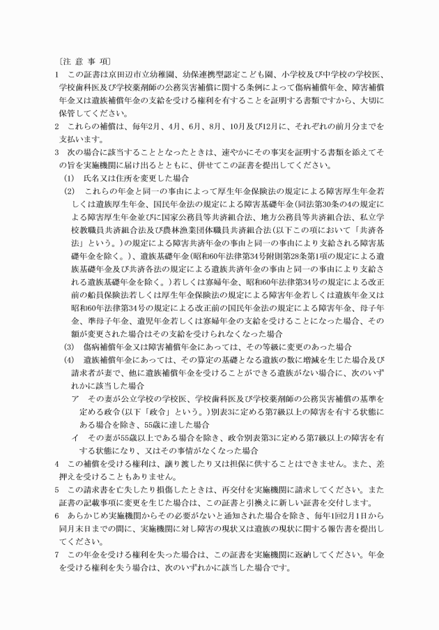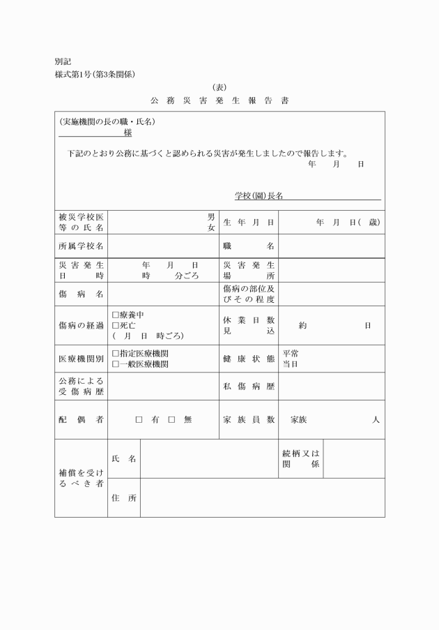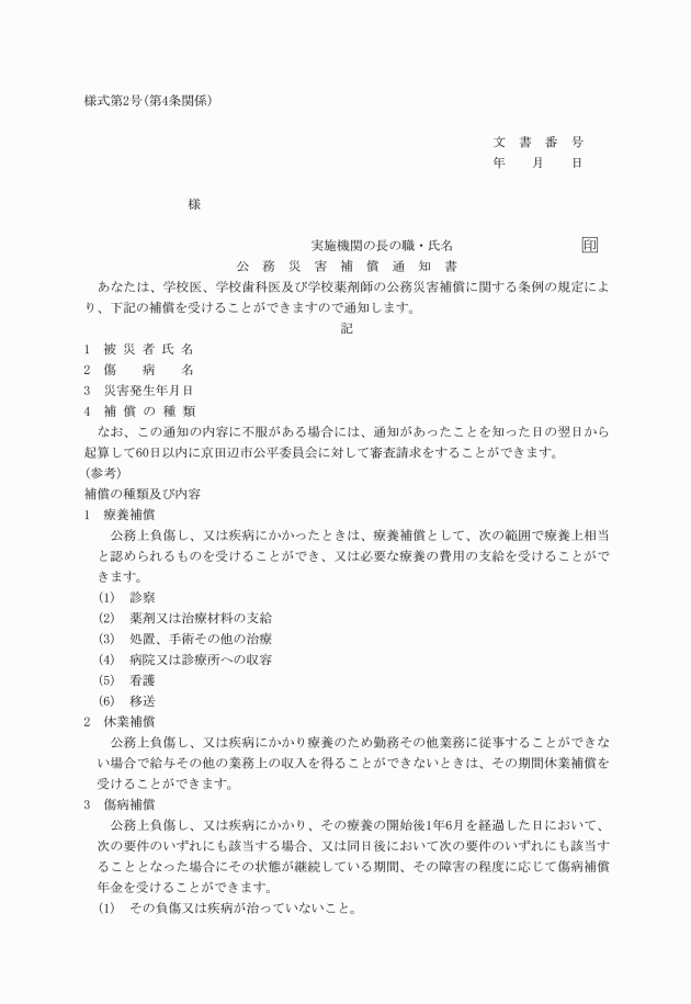 第3条 京田辺市立の幼稚園、小学校又は中学校(以下「学校」という。)の長(以下「学校長」という。)は、その学校の学校医等について、公務に基づくと認められる災害が発生した場合は、速やかに当該実施機関に公務災害発生報告書(別記様式第1号)により報告しなければならない。
