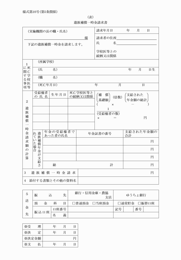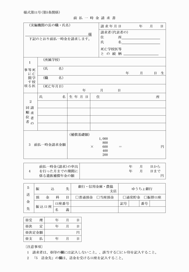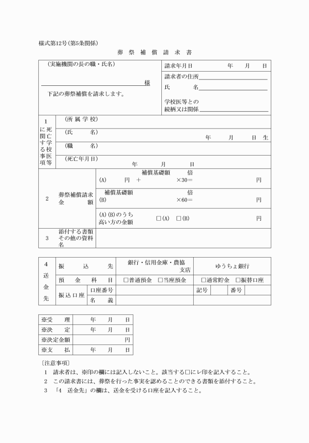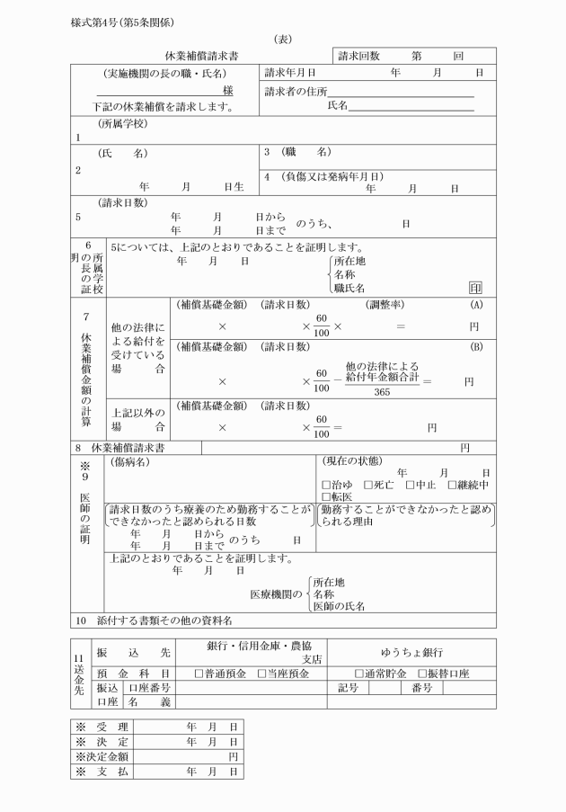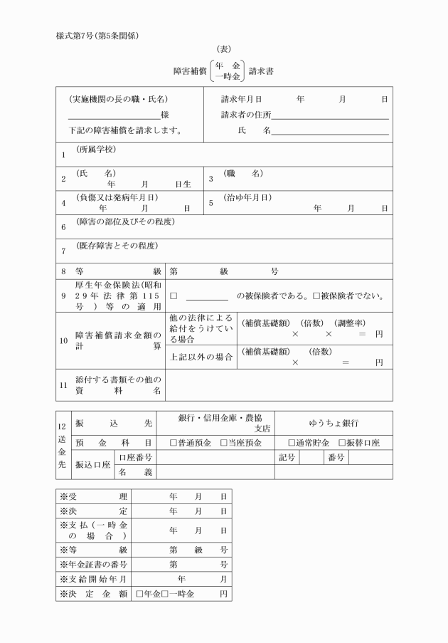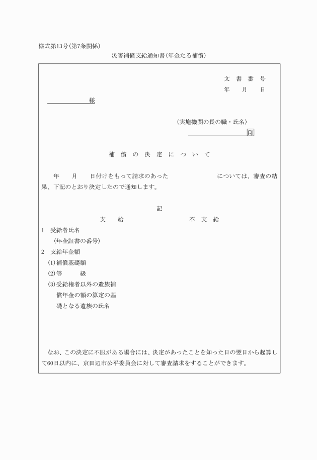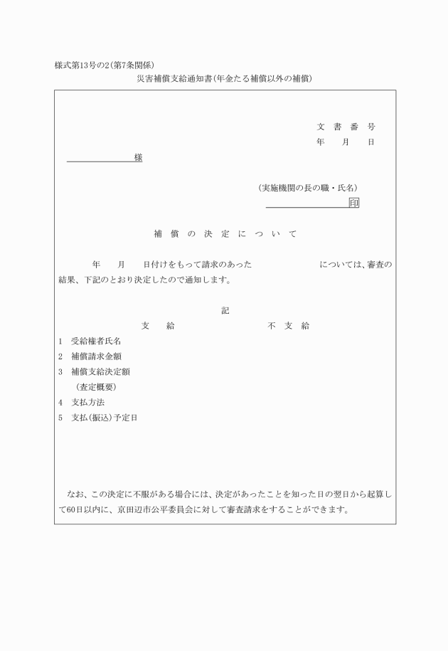 第7条 実施機関は、補償の請求書を受理したときは、これを審査し、補償に関する決定を行い、速やかに請求者に対し災害補償支給通知書(別記様式第13号又は別記様式第13号の2)によりその決定に関する通知をするとともに、補償を行わなければならない。