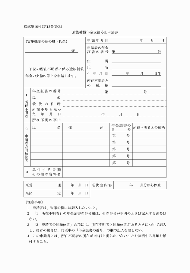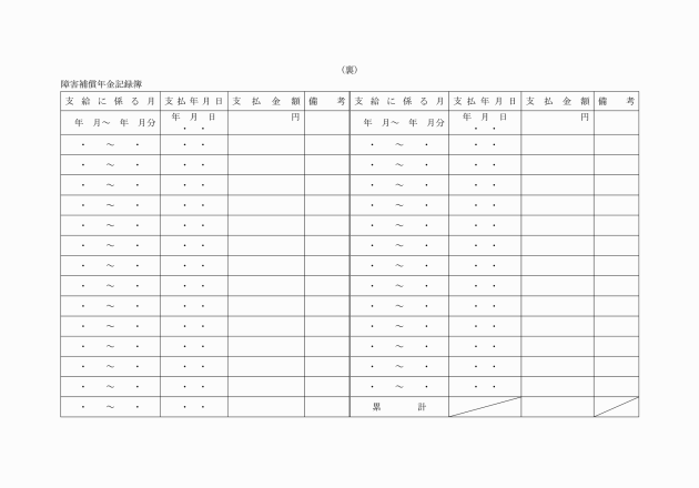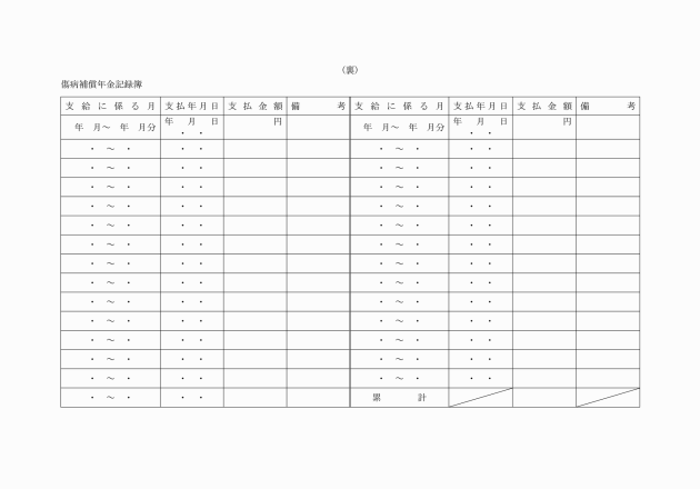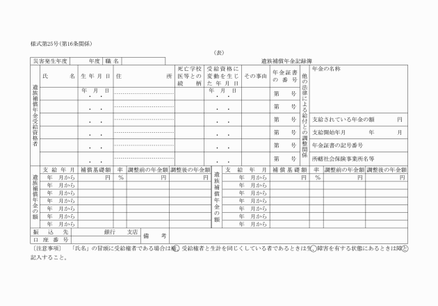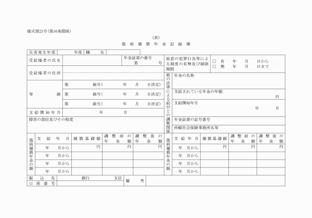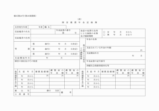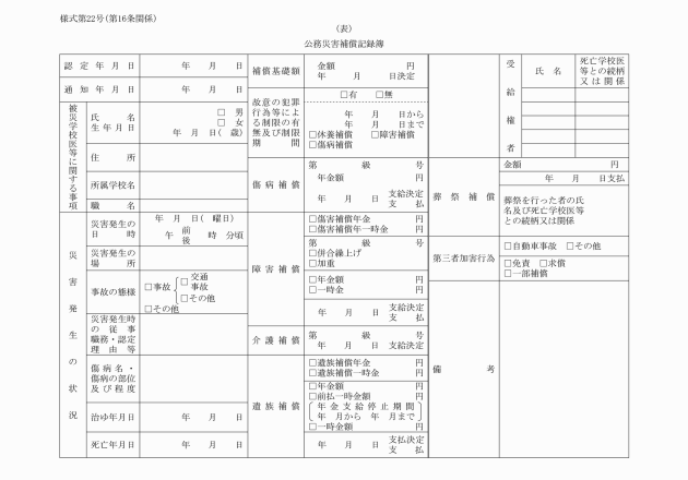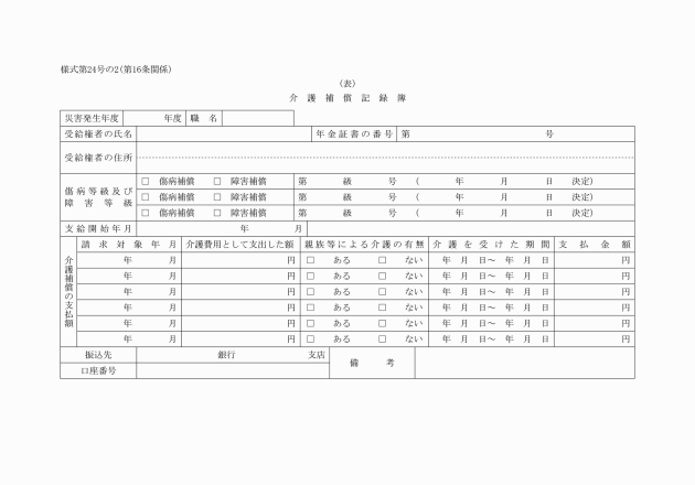 第16条 実施機関は、公務災害補償記録簿(別記様式第22号)、傷病補償年金記録簿(別記様式第23号)、障害補償年金記録簿(別記様式第24号)、介護補償記録簿(別記様式第24号の2)及び遺族補償年金記録簿(別記様式第25号)を備え、必要な事項を記入しなければならない。