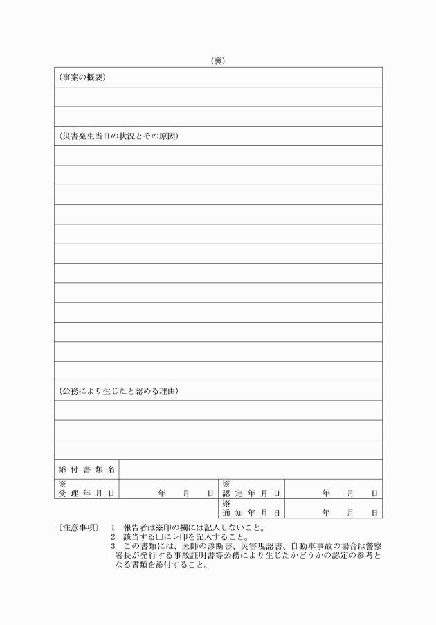 第4条 実施機関は、公務災害の発生の報告を受けたときは、その災害が公務上のものであるかどうかを認定し、公務上のものであると認定したときは、速やかに公務災害補償通知書(別記様式第2号)により補償を受けるべき者に通知しなければならない。