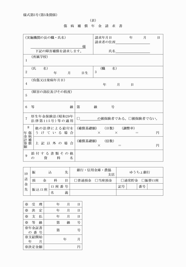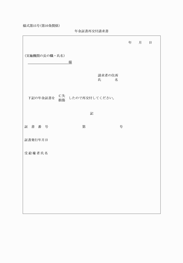 第10条 年金証書の交付を受けた者は、その年金証書を亡失し、又は著しく損傷したときは、年金証書再交付請求書(別記様式第15号)に亡失の理由を明らかにすることができる書類又は損傷した年金証書を添えて、実施機関に対し年金証書の再交付を請求することができる。