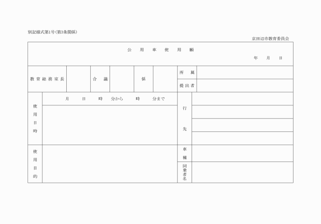 第3条 マイクロバスを使用する者は、所属長の承認を得て、公用車使用願(別記様式第1号)を教育総務室長に提出し、その許可を受けなければならない。