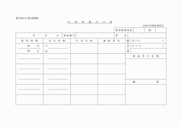 第4条 運転者は、マイクロバス使用後、公用車運行日誌(別記様式第2号)に必要事項を記入し、速やかに車両のかぎを添えて、教育総務室長に提出するものとする。