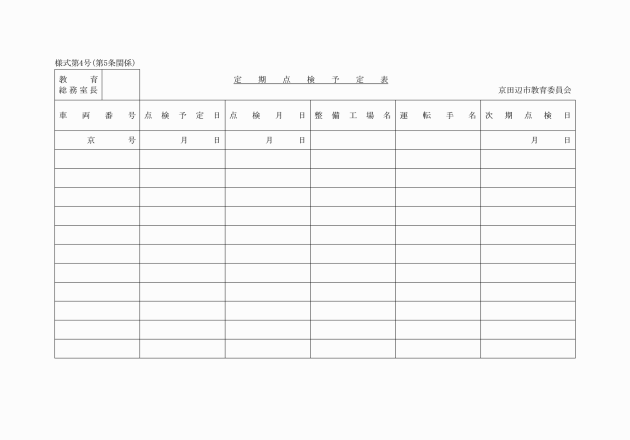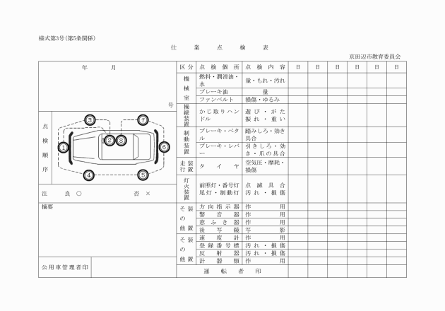 第5条 マイクロバスの管理上必要な車両点検は、仕業点検表(別記様式第3号)による仕業点検のほか、毎月点検を教育総務室長が行うものとする。