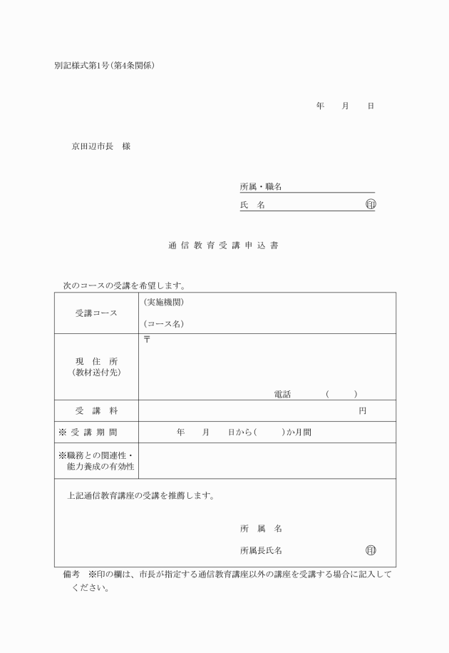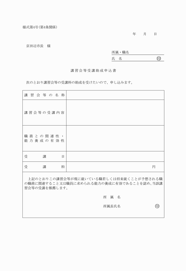 4 講習会等受講料の助成を希望する職員は、事前に講習会等受講助成申込書(別記様式第4号)を市長に提出しなければならない。