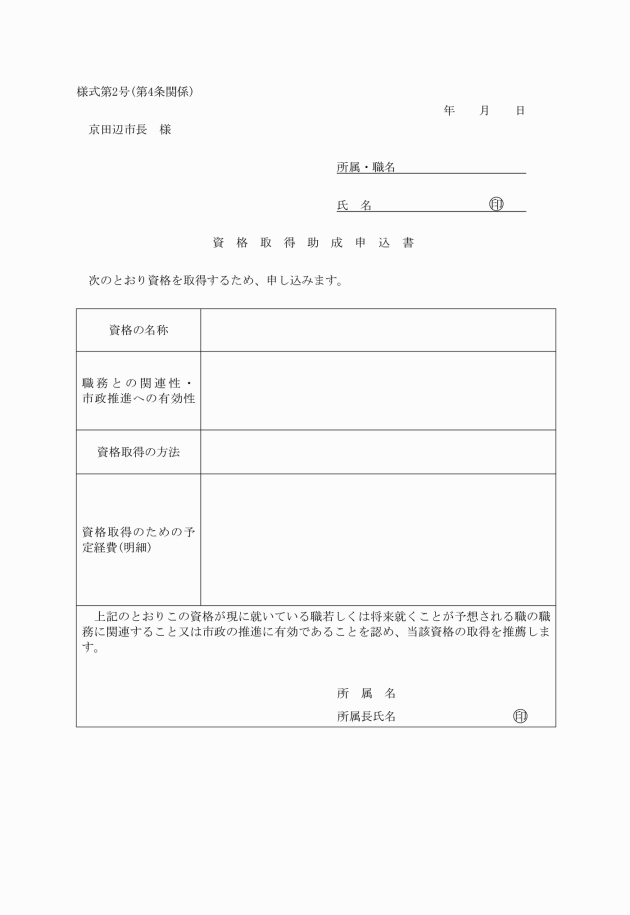 2 資格取得に要する費用の助成を希望する職員は、事前に資格取得助成申込書(別記様式第2号)を市長に提出しなければならない。