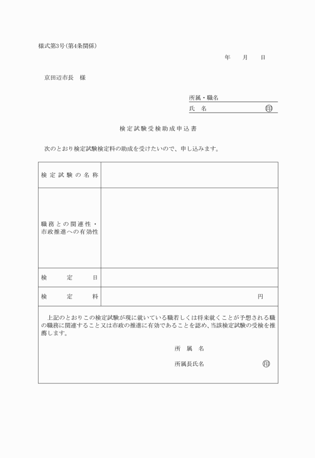 3 検定試験検定料の助成を希望する職員は、事前に検定試験受検助成申込書(別記様式第3号)を市長に提出しなければならない。