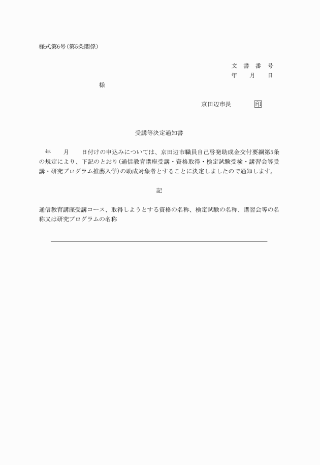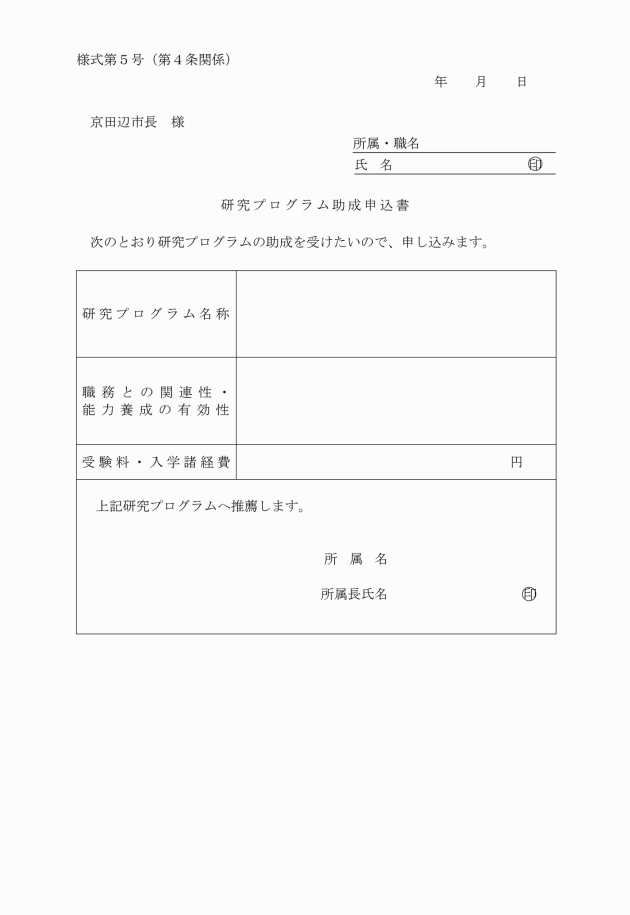 5 研究プログラム推薦入学に要する費用の助成を希望する職員は、事前に研究プログラム推薦入学助成申込書(別記様式第5号)を市長に提出しなければならない。