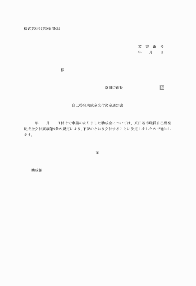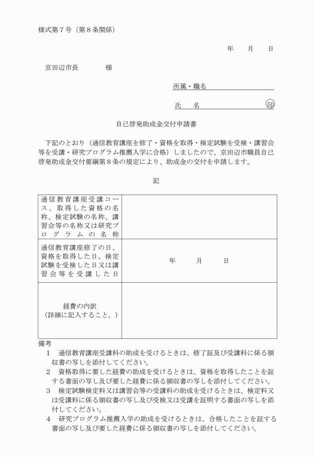 第8条 助成金の交付を受けようとする者(以下「申請者」という。)は、自己啓発助成金交付申請書(別記様式第7号)に修了したこと、資格を取得したこと、検定試験を受検したこと、講習会等を受講したこと又は研究プログラム推薦入学試験に合格したことを証する書面を添えて、市長に申請するものとする。