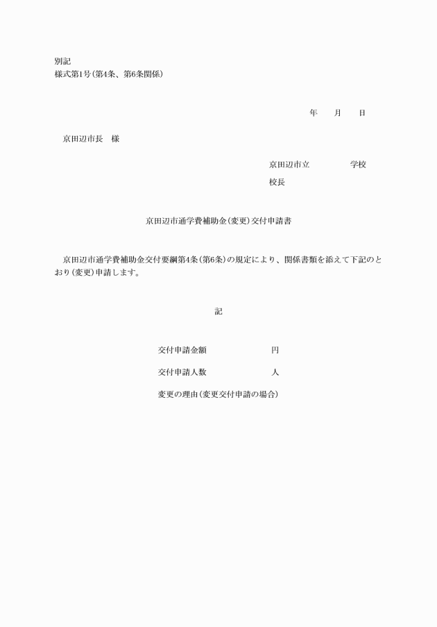 第1条 この告示は、遠距離通学に要する経費の一部を補助することにより保護者の負担軽減及び義務教育の機会均等を図るため、京田辺市通学費補助金(以下「補助金」という。)の交付に関し必要な事項を定めるものとする。