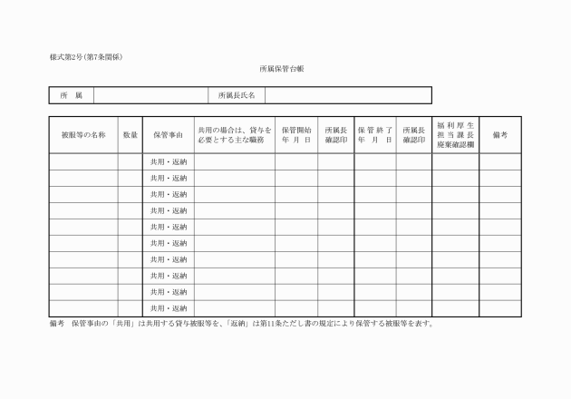 2 所属長は、共用被服等その他所属長が保管する被服等がある場合は、当該被服等を管理するため所属保管台帳(別記様式第2号)を備え、常に当該被服等の保管状況を明らかにしておかなければならない。