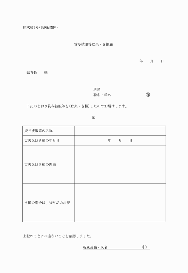 第9条 被貸与職員は、貸与期間内に、貸与被服等を亡失し、又はき損して使用できなくなったときは、貸与被服等亡失・き損届(別記様式第3号)に、亡失した場合を除き当該貸与被服等を添えて、速やかにその旨を所属長及び福利厚生担当課長を経て教育長に届け出なければならない。